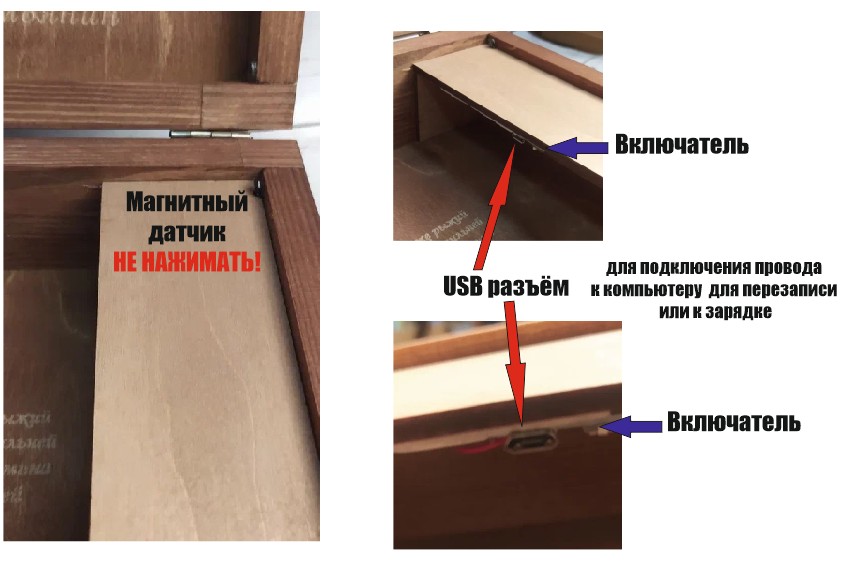 - Для записи новых мелодий в формате MP3 на шкатулку - подсоедините USB провод к компьютеру и будет доступен диск для записи. Если на модуле записано несколько мелодий, то при открытии крышки будет воспроизводиться следующая мелодия по кругу.